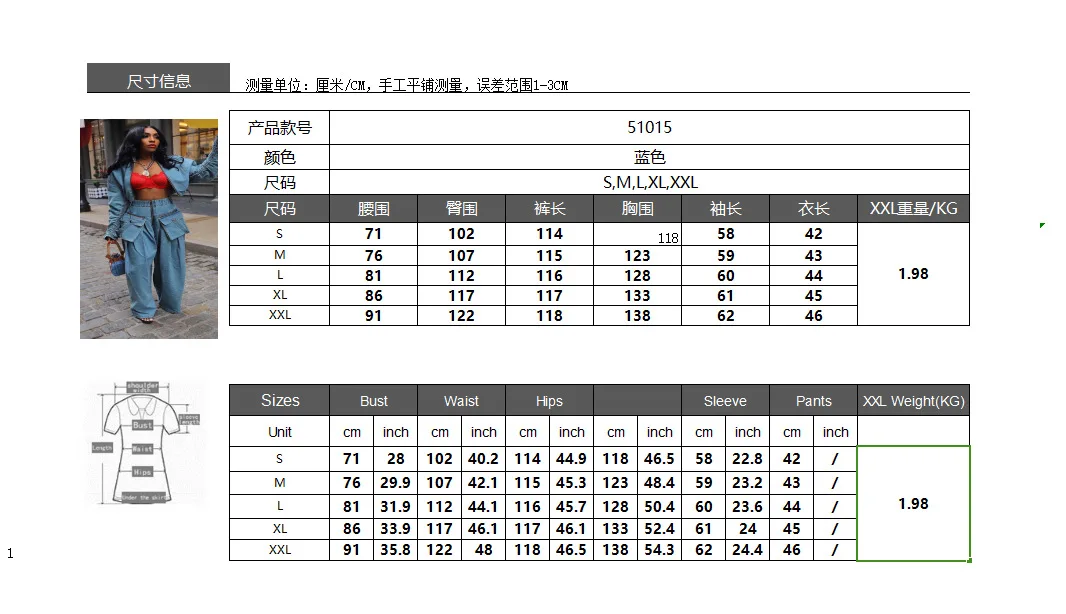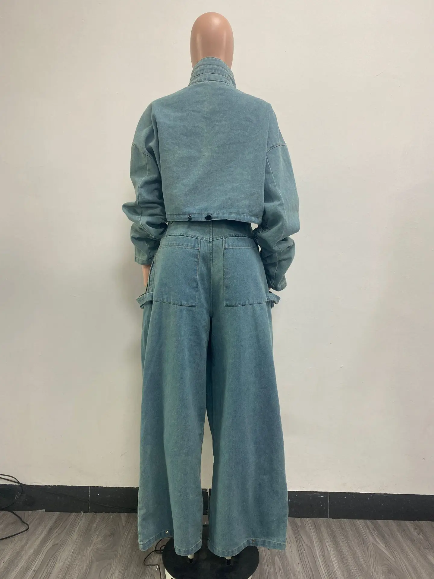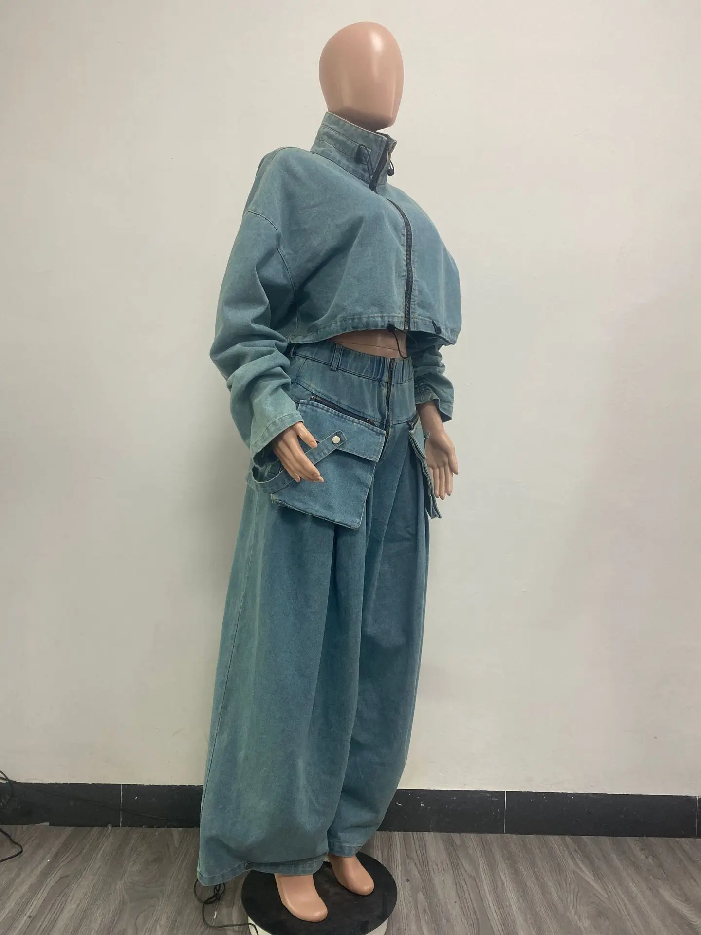 51015 Denim Jacket Multiple Pockets Zipper Jeans Baggy High Waist Cargo Distress Jeans Two Piece Set Women Clothing